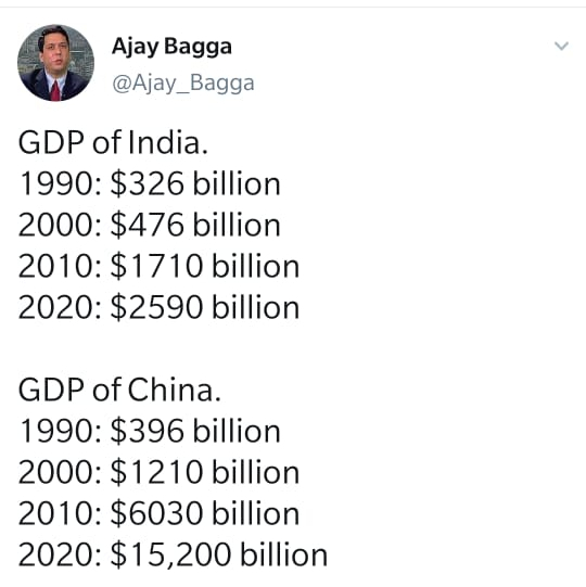 While China focused on becoming the manufacturing hub of scale for the world by focusing on its blue collar labour, India preferred to leverage its English educated younger population to focus on becoming the back office thereby creating white collar jobs. China’s decision of focusing on the blue collar jobs benefited them tremendously by putting more income in the hands of a larger cross section thereby creating a huge virtuous cycle of domestic demand. The success is clearly visible in the GDP growth over the last 30 years represented in the twitter quote from Ajay Bagga (one of the most respected experts in the finance industry).